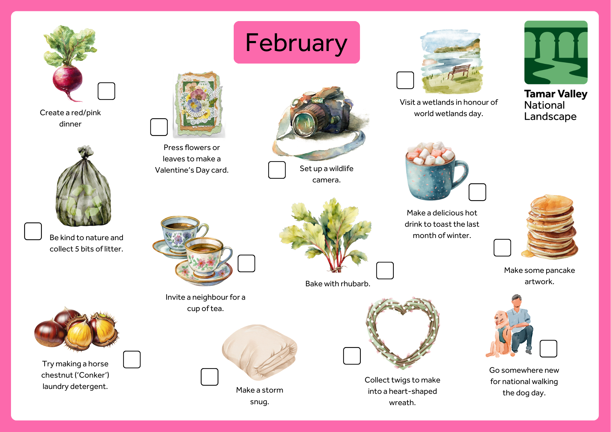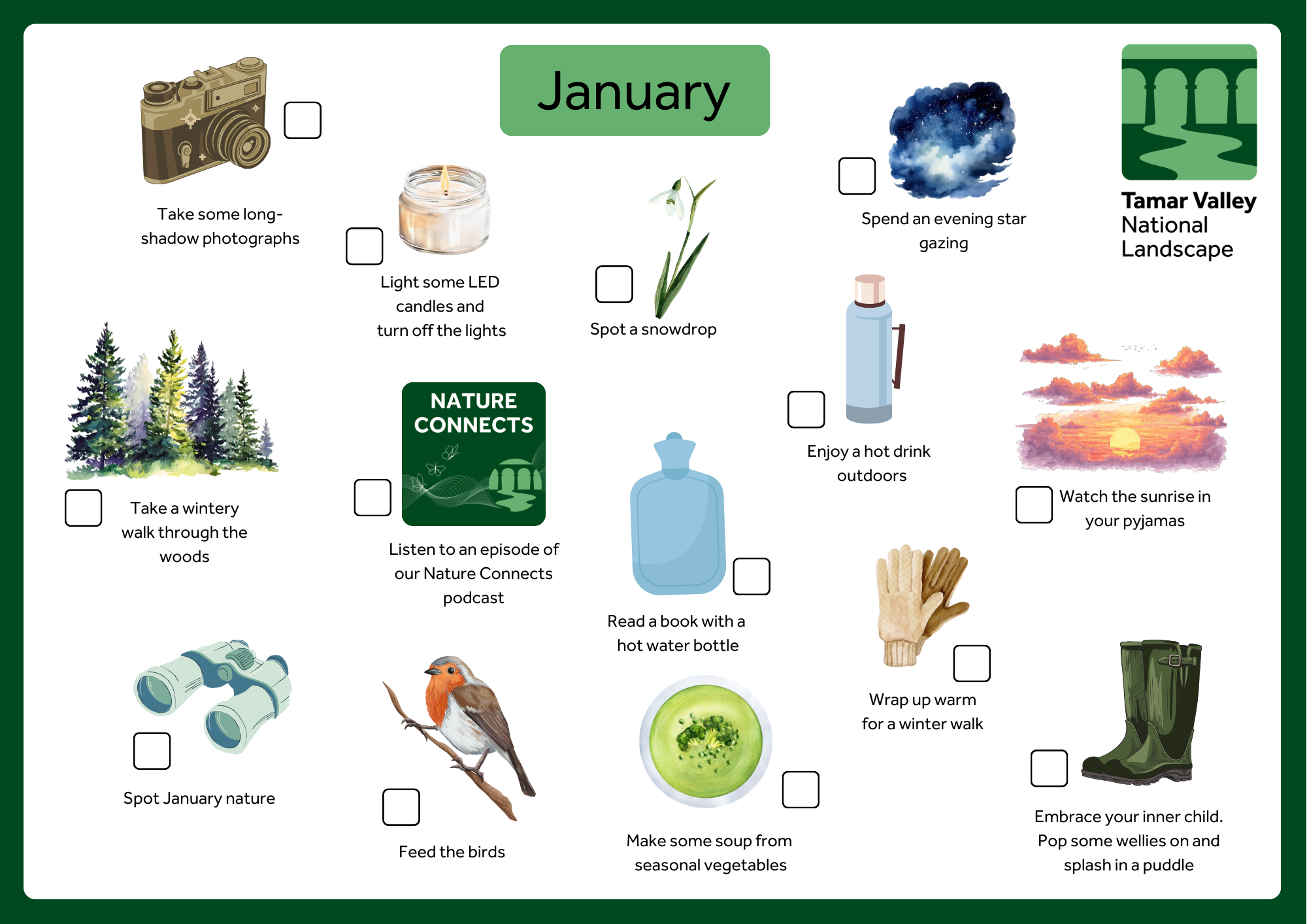 January is all about trying new things and reaching our goals. Although it’s often a quiet month when many of us prefer to stay cosy indoors, our activities offer a mix of comforting things to do inside, as well challenges that invite you to step outdoors. It’s the perfect time to embrace the crisp winter weather and notice the small but resilient signs of nature that often go unseen at this time of year.